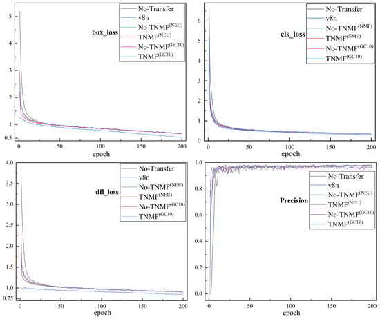 Figure 5 displays the loss and precision curves for the six experimental groups. As shown in Figure 5, Experiment 2, which utilizes pre-trained v8n weights from the COCO dataset, exhibits significantly lower loss compared to the other five experiments. This advantage of low loss is a consequence of deep learning utilizing generic large datasets that can be trained. Compared to loading the pre-training weights, the convergence of the directly trained Experiment 1 is significantly more lagging in the precision curve, and the loss curve also starts falling from the highest loss value. The distinction between Experiment 3 and 4 lies in the utilization of the TNMF method. Although the discrepancy in the loss curve is marginal, the divergences in the precision curves are more pronounced. Experiment 4, which employs the TNMF approach, demonstrates superior performance compared to Experiment 3, particularly noticeable in the early oscillations and the smoother convergence observed in the later stages. In using GC10-DET as the source domain dataset, TNMF(GC10) with the application of TNMF likewise outperforms No-TNMF(GC10) in terms of accuracy profile. The performance of both source domain datasets corroborates the effectiveness of the TNMF method in migration.