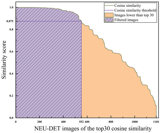 After completing the joint Twin-NMF process with the NEU-DET and ECTI-50 datasets, cosine similarity is utilized in the screening stage. This involves calculating the cosine similarity for each image in ECTI-50 against all images in NEU-DET, ordering the results by the magnitude of the cosine similarity values. For a single image from ECTI-50, the cosine similarities with all NEU-DET images are calculated, and the top 30 images exceeding the threshold are selected as samples strongly associated with the ECTI target domain. From the NEU-DET dataset, a total of 1181 images were included in the top 30 cosine similarity rankings, with 552 images identified as having strong correlations above the threshold value.