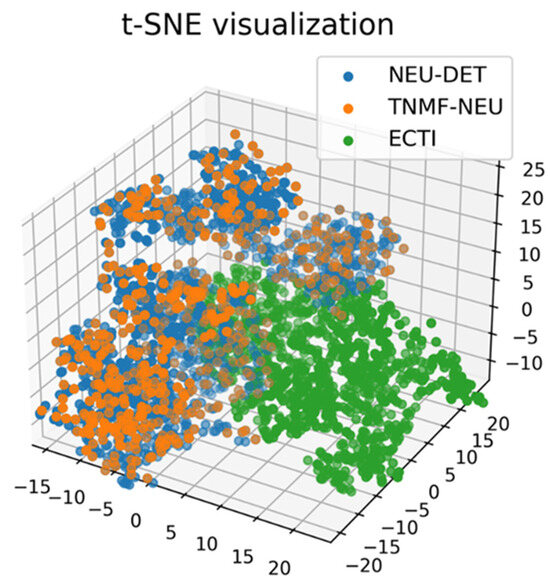 In three-dimensional space, it can be observed that the green ECTI dataset forms a relatively centralized cluster and overlaps with the other two datasets (NEU-DET and TNMF-NEU, which apply the TNMF screening process) in certain areas. The TNMF-NEU dataset, under the TNMF method, retains some of the feature distributions of the original NEU-DET dataset. At the same time, when examining the degree of overlap between different clusters and the tightness within each cluster, it can be seen that TNMF-NEU is converging toward the ECTI dataset. This suggests that TNMF introduces new features while preserving the original data features, making the data distribution closer to that of the target domain. However, feature tuning alone may not be sufficient to fully compensate for the distributional differences between the source and target domains. Thus, while TNMF can facilitate domain adaptation from the source domain to target domain tasks to some extent, it does not completely eliminate the variability between the two.