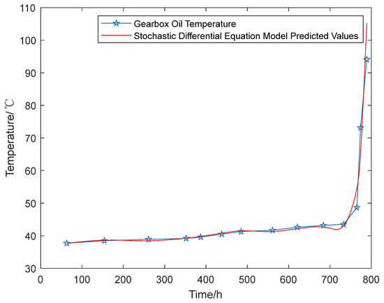 - The difference between the predicted value of the stochastic differential equation model and the actual value of the oil temperature increased significantly after the running time reached 733 h, a phenomenon that indicates that the effect of stochastic perturbations on the gearbox oil temperature becomes more significant as oil temperature increases.