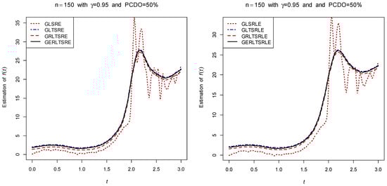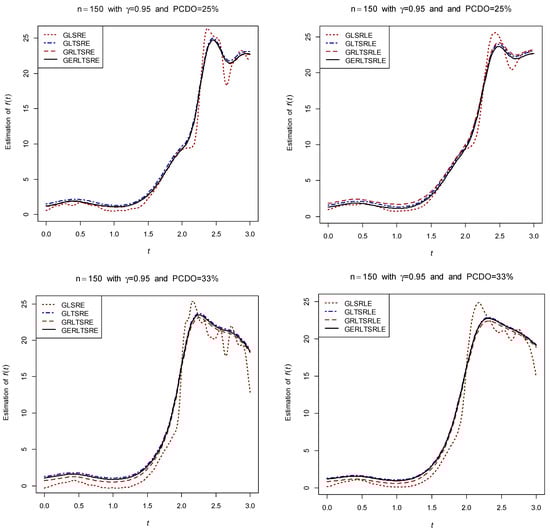 The results from the Monte Carlo simulations for n = 150, p = 5 and are presented in Table 1, Table 2, Table 3, Table 4, Table 5, Table 6, Table 7, Table 8, Table 9, Table 10, Table 11, Table 12, Table 13 and Table 14 and Figure 2. From these tables, it can be seen that the factors affecting the performance of the estimators are the degree of correlation () between the explanatory variables and the percentage of the data contaminated with outliers (PCDO). From these tables and Figure 2, it is clearly concluded that if the levels of PCDO and multicollinearity increased, then the mean squared error estimations for both the linear and non-linear parts of the GLSRE would be highly increased. Also, increasing the level of the PCDO increases the mean squared error estimations for both the linear and non-linear parts of non-robust estimators, while increasing the level of multicollinearity increases the mean squared error estimations for both the linear and non-linear parts of non-Liu estimators. From Table 1, Table 2, Table 3, Table 4, Table 5, Table 6, Table 7, Table 8, Table 9, Table 10, Table 11, Table 12, Table 13 and Table 14 and Figure 2, it can be seen that the GERLTSRLE often performs better than the other methods since it offers the smallest mean squared error estimations (bold values) for both the linear and non-linear parts of the models in most of the simulated schemes.