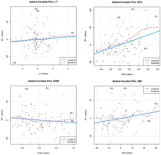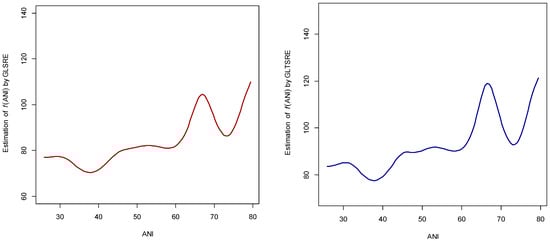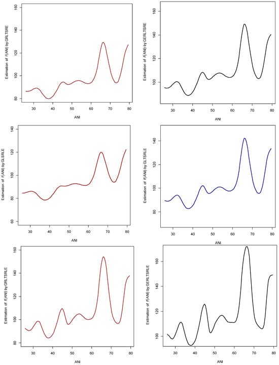 We use added-variable charts to intuitively determine the parametric and nonparametric components of the model (see [46] for more details). Added-variable plots allow us to examine each predictor’s influence graphically after adjusting for the effects of the other explanatory variables. Based on the analysis of its added-variable plot (Figure 3), we identify ANI as a nonparametric component. Therefore, the partially linear model is specified as follows: