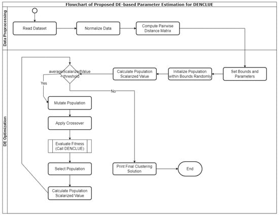 The proposed methodology primarily consists of two phases: the data preprocessing phase and the DE-based parameter optimisation phase. The input dataset is prepared to facilitate subsequent clustering in the data preprocessing phase. The DE optimisation process fine-tunes the parameters of the DENCLUE algorithm with the objective of improving clustering quality. This method applies strategies to carefully balance the exploration and exploitation of the search space, thus ensuring efficient convergence towards optimal clustering solutions. A flowchart for the proposed methodology is shown in Figure 1, and the pseudocode for the proposed method is listed in Table 2. The code used for this method is publicly available (https://github.com/omerdotajmal/mulobjdenclue, accessed on 20 August 2024) for access and review to facilitate reproducibility and further exploration. The code is licensed under CC BY 4.0, which allows for sharing and adaptation with appropriate credit.