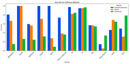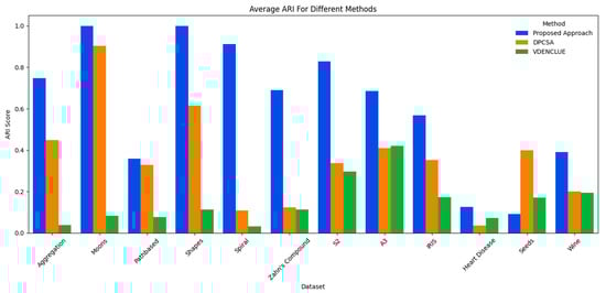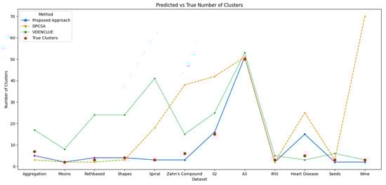 The real-world benchmark datasets used were IRIS, Heart Disease, Seeds and Wine obtained from the UCI Machine Learning repository [] and cover different domains, such as biology, healthcare and agriculture, ensuring a balanced and extensive evaluation of the clustering method. While the synthetic datasets, all two-dimensional, represent the inherent complexity in cluster structures, the real-world datasets have increased dimensionality and cluster overlap [,,,,,,]. The inherent noise and outliers in the real-world dataset are common characteristics reflecting realistic scenarios the proposed method is designed to handle. However, a detailed study of the proposed method under artificially injected varying noise levels has been submitted as a separate study and is currently under review. Table 3 lists the details of the datasets used, including the number of instances (sample size), the number of features (dimensionality), the number of true clusters and the rationale behind their selection.