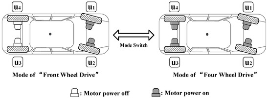 Now, let us examine a sports utility vehicle (SUV) powered by electric motors, as shown in Figure 2. This SUV has two drive modes: front-wheel drive and four-wheel drive. In front-wheel drive mode, the driving force is generated by the two front wheels (motors), denoted as and . In contrast, all four motors are utilized to propel the vehicle in four-wheel drive mode. The following expression is employed to describe the SUV: