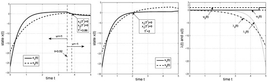 Time-optimal control of Example 1. Left: Dynamics of the optimal states for Equation (44) without input redundancy, where . Center: Dynamics of the optimal states for Equation (45) with input redundancy, where . Right: Dynamics of the costate vector and the optimal control for Equation (45) with input redundancy, where , .