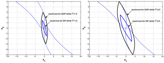 Isochrones of time-optimal control for Example 2. Left: Isochrones of for the DIP and EDIP. Right: Isochrones of for the DIP and EDIP.