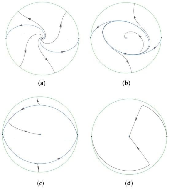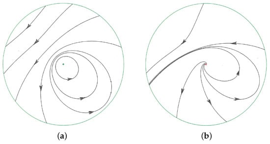 Now, assume that either , or and . Now, from Proposition 1, the differential system (2) has a focus at the origin of coordinates, stable if and unstable if . By statement (a) of Theorem 1, when , the system has no limit cycles, and when , by statement (c) of Theorem 1, since the degree of the system is , it also has no limit cycles. Again, by Proposition 2, we know its dynamics at infinity. Hence, its phase portrait in the Poincarè disc is given in Figure 2b. □
