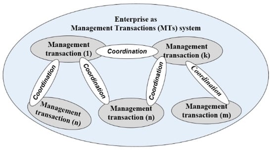 The conceptual model of academic institutions was developed based on the enterprise causal modeling approach [9]. This causal modeling method is intended for enterprise management modeling, where knowledge about enterprise internal activities and their causal dependencies is discovered, including the content of management information [8,9]. The causal modeling approach considers an organizational system (any type of enterprise) as a system of self-managed activities, defined here as management transactions (Figure 1) [8,9].