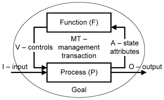 The key concept in the causal modeling approach is a management transaction (MT), depicted in Figure 2 [8,9]. Any activity (in the case of the university, an academic activity) is defined as MT = (F, P, A, V), where F is the management function (domain activity that performs data processing and decisions); P is the process domain activity controlled by F; A = (a(1), a(2), …, a(n)) is an information flow of process P state attributes; and V = (v(1), v(2), …, v(m)) is an information flow of controls (impacts) to process P. This level of detail includes an explicit specification of the goal related to the definite activity. It is important that any activity in the problem area be considered a self-managed system with a defined goal G. Therefore, an MT is associated with a definite goal G relevant to the enterprise’s (e.g., academic institution) activity.