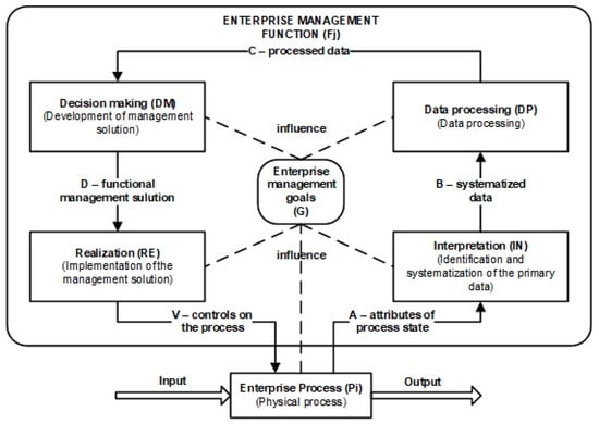 A management transaction (see Figure 2) is decomposed and defined in detail as the elementary management cycle (EMC) [8,9], depicted in Figure 3. The elementary management cycle (EMC) framework reveals the internal steps of the enterprise management function Fj (G), internal information flows, and their interactions with enterprise process Pi (G). All elements and interactions depend on enterprise management goals G. Four types of information transformation steps are identified in the EMC framework by decomposing the internal structure of management function Fj: IN—interpretation of state data (data acquisition), DP—data processing, DM—decision making, and RE—realization of decisions (controls). The EMC framework includes an enterprise management goal (G) and goal-driven management information flows (A, B, C, D, and V):