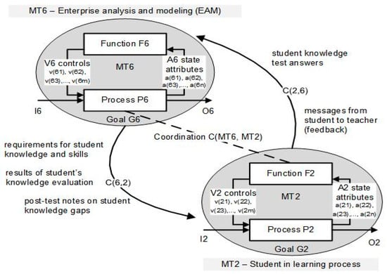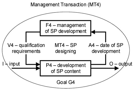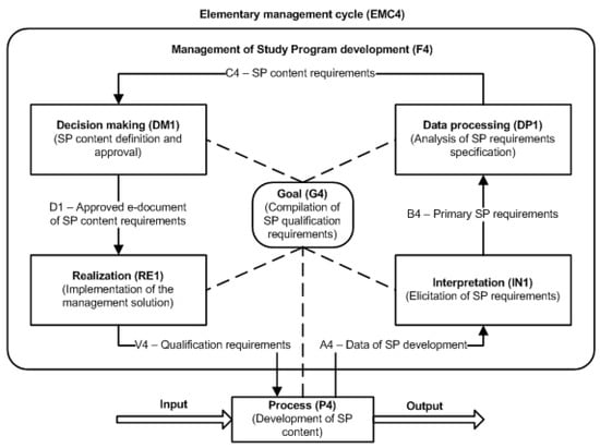 We explain the internal causal interactions in the model of activity MT4, study program designing, shown in Figure 4. MT4 comprises a closed-loop interaction between the management function F4, management of SP development and process P4, development of SP content, which is associated with goal G4, compilation of SP qualification requirements that meet the needs of the market. The management control of this activity, study program designing, is provided by the feedback between F4 and P4, which is created by flow A4, data of SP development (state of P4), and flow V4, qualification requirements (controls). Making full use of the causal modeling constructs described in [8,9], the conceptual model of the academic activity, study program designing, can be decomposed, revealing more detailed granularity (as shown in Figure 6) using the concept of “elementary management cycle” (EMC) [8,9].