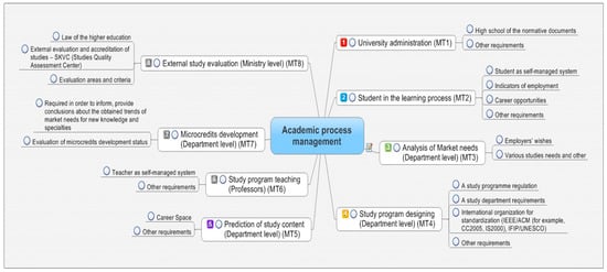 All countries or universities have their own experience-based approach to the analysis and modeling of academic processes [14,15,16,17,18,19,20,21,22]. The content of its internal processes and the features of its interaction with the external environment (market and employers) characterize the quality of an academic institution. Usually, the set of performance characteristics is defined by self-analysis documents regulated by an external institution (higher management-level authority) and internal documents of the institution itself (for example, senate resolutions, rector’s orders, or dean’s orders).