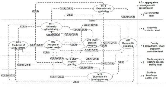 Academic high schools’ (universities and colleges) teaching and research activities must be coordinated by determining the necessary interactions to ensure the efficiency and quality of results. A causal modeling approach was developed for enterprise management modeling and application software development [8,9]. In this study, causal modeling was applied to analyze the academic institution’s performance. The focus is on creating a study process management and control model based on the discovered causal dependencies between academic activities. Academic activities are considered self-managed processes and are defined as management transactions with a predefined internal structure. Any academic activity is defined as a management transaction MT = (F, P, A, V), where F is the management function (an information-transformation and decision-making step), and P is a physical process that converts inputs (resources, energy, materials, and students) into outputs (products, services, and graduates). The management function F monitors and controls process P via a feedback loop involving the state attributes A of process P and the controls (effects) V in process P. Each activity defined as an MT is also associated with a goal description that is not strictly specified at this level of model detail. In this way, the internal structures of all academic activities and internal information interactions between parts of their structure are unified (normalized). This makes it possible to create templates for specifying the internal elements of all academic activity types. In this way, the information (data, knowledge, and goals) about each necessary academic activity is systematized. The main principles of constructing a causal model of academic activities by studying the dependencies of these activities are presented and illustrated herein. The study management process of one university was studied in detail, and the most important types of activities, MT1–MT8, were identified. A causal model of the hierarchy of academic activities enables the coordination of the study process and the identification of the interactions necessary to ensure the efficiency of studies and the quality of results. The importance of the informational (coordinating) mutual interactions of the activities of the recommended model was assessed using a survey of experts (staff members) and students (separately) on a scale from 0 (unnecessary) to 5 (determining). The model of the study process created using this method is an example of a causal system that allows for rethinking the coordination of the study process according to the goals set by the institution. The causal model determines the content of interactions between processes and activities and considers the levels of the institution management hierarchy (Figure 8). The content (and data exchange) compatibility of all activities can be systematized according to the causal model. The principles of creating and using the causal model allow for analyzing the existing study process evaluation methodologies, objectively evaluating the importance of the indicators defined in these methodologies, and detecting specific evaluation methodology and communication gaps in the institution’s internal processes. The causal model of existing coordination interactions was revealed (Table 7) after the existing regulations were analyzed. The comparison of the created causal model with the methodology used in practice allows for the detection of the shortcomings of the existing methodology used for evaluating the academic performances of universities. The comparison allows for a systematic analysis of regulations and the consistent identification of the relevant aspects of academic activity and new indicators.