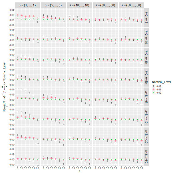 We undertake a series of simulated trials to assess whether the introduced approximation is effective. To evaluate whether the approximation is accurate, we perform a Monte Carlo simulation to estimate in accordance with null hypothesis assumption and compare to the nominal level. We evaluated two distinct values of k: 2, 3. Additionally, we consider five possible cases of , namely, (1,…,1), (5,…,5), (10,…,10), (30,…,30), (50,…,50). Sample sizes of 5, 10, 30, 50 are simulated to evaluate the effects of sample size. Due to the non-positive definiteness of the covariance matrix for , the present study concerns six values of : 0, 0.1, 0.3, 0.5, 0.7, 0.9. Krummenauer’s [33] algorithm is used to simulate 10,000 samples from each of the given multivariate Poisson populations to calculate . To estimate , we determine the percentage of the 10,000 simulated values that exceed . Accordingly, better performance is associated with smaller deviations of from the nominal levels.