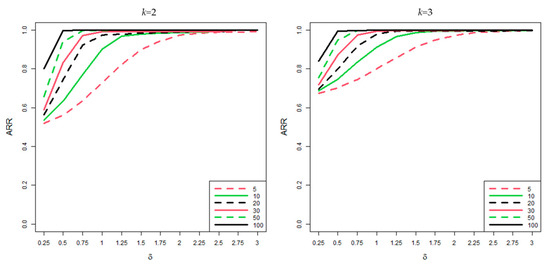 The relationship between and the ARR under case I for various sample sizes with k = 2 and k = 3.