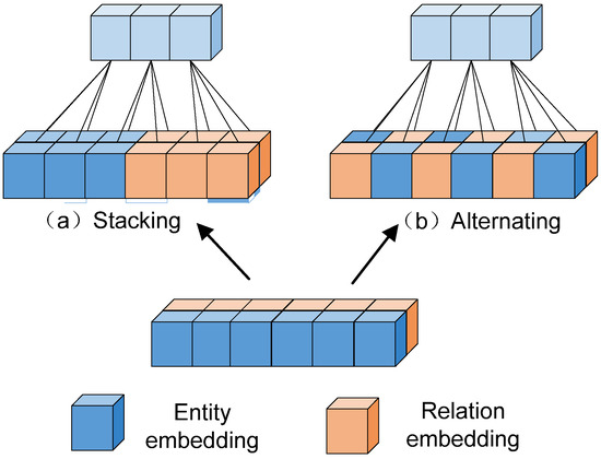 In knowledge graphs, triplets exist in forms such as text, numerical values, and symbols, which cannot be directly computed. Therefore, -dimensional embeddings are initialized for all entities and relations , generating vector representations for entities and relations . In order to more accurately establish the connections between entities and relations, the entity embeddings and relation embeddings are treated as a whole to capture more semantic information. During the vector reshaping process, the traditional stacking method is abandoned in favor of the alternating reshaping method, aimed at enhancing the interaction between entities and relations to capture more latent information. As shown in Figure 2, the alternating reshaping method is used to connect an entity and a relation, resulting in the following matrix [16]:
