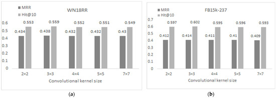 To investigate the role of the convolution kernel size in the link prediction performance of the proposed model, corresponding experiments were conducted on the FB15k-237 and WN18RR datasets, with the following kernel sizes: {2 × 2, 3 × 3, 4 × 4, 5 × 5, to 7 × 7}. The obtained MRR and Hit@10 results are depicted in Figure 3.