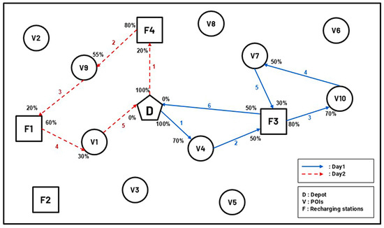 Figure 1 illustrates an example of feasible routes for two-day trip planning obtained from the proposed problem. The problem consists of one depot, a set of POIs, and a set of recharging stations. The trips are performed by a BEV with fixed battery capacity. For each day, the trip must start and end at the depot, and the vehicle begins with a fully charged battery. While a vehicle moves, its battery state decreases proportionally with the distance traversed. It is noted that the battery consumption rate between two specific nodes is constant but may vary between other pairs of nodes. The vehicle may need to visit recharging stations in order to continue its route and return to the depot with adequate battery. It is possible that a recharging station may be revisited twice or more. As seen in Figure 1, routing for the first-day trip is depot-V4-F3-V10-V7-F3-depot. According to recharging guidelines at DC fast charging stations, the vehicle’s first charge at station F3 can only reach 80%, not 100%. After visiting V7, the vehicle’s state of charge at 50% is insufficient for a direct return to the depot. Therefore, the vehicle opts to be recharged at station F3, increasing the state-of-charge from 30% to 50%, before returning to the depot. The vehicle is then fully charged at the depot before it begins the next-day trip. The routing for the second-day trip is depot-F4-V9-F1-V1-depot. It is also noted that the routing sequence is represented by the number on the arcs, and the percentage value indicates the remaining battery-state-of-charge.