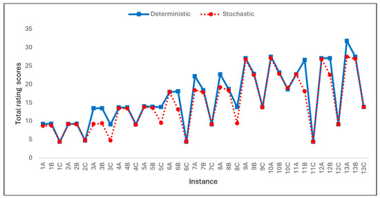 Comparison of total rating scores for deterministic scenarios and the stochastic model.