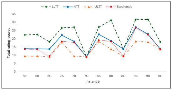 The results in Table 3 show that the deterministic model with the LLTT scenario consistently yields total rating scores that are greater than or equal to those from the MTT scenario, which in turn provides greater than or equal to those obtained from the ULTT scenario for all instances. This is because the travel times in the LLTT scenario are relatively shorter than those in the MTT and ULTT scenarios. These results also indicate a relationship between travel times and obtained total rating scores, with longer travel times being negatively associated with lower scores. In addition, it is obviously seen that the total rating scores from the stochastic model consistently fall within the spectrum between the LLTT and ULTT scenarios of the deterministic model for all instances. Figure 3 further illustrates this relationship.