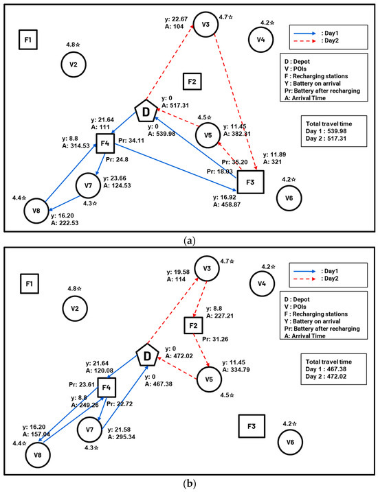 For instance 9B, the routes and total rating scores obtained from the deterministic and stochastic models differ. As shown in Figure 5a,b, the number of visited POIs and number of recharging stops are the same, but the specific POIs and recharging stations visited are different. The route from the deterministic model travels longer distances to select POIs with higher scores as much as possible. In contrast, due to travel time uncertainty, the stochastic model opts for shorter distances and selects POIs with lower scores to avoid exceeding the daily travel time horizon.