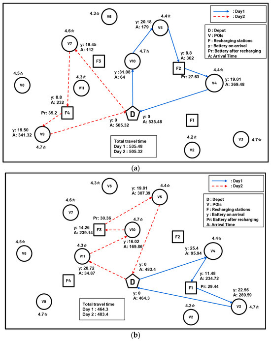 Equation (1) is the objective function for maximizing the total rating score obtained from the visited POIs. Equation (2) ensures that each node can be visited at most once. Equations (3) and (4) state that each day trip starts and ends at the depot. Equation (5) expresses a flow conservation constraint. Equation (6) establishes the feasible departure time from POIs, with the constraint that the probability of satisfying this condition must be at least . Equation (7) states that the probability of the constraint must be satisfied by at least to ensure the feasible departure time from recharging stations. Equation (8) states that each POI can only be visited within its time window. Equation (9) ensures that, for each day, the total travel time does not exceed the limited time horizon, . Equation (10) keeps track of the battery-state-of-charge on arrival at any subsequent node and ensures that it does not exceed its capacity. Equation (11) determines the battery-state-of-charge on arrival at any subsequently node after recharging. Equations (12)–(14) govern the battery-state-of-charge to remain between allowable lower bound and upper bound levels. Equations (15) and (16) state that decision variables are binary and non-negative, respectively.