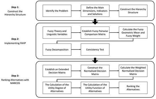 Based on the literature review, the methods of FAHP and MARCOS have proven effective in addressing MCDM problems within sustainability fields. Notably, Tešić et al. [71] highlighted the MARCOS method as a powerful and robust tool for multi-objective optimisation, employing both ratio and reference point methods to generate a comprehensive decision information scheme. Meanwhile, Ecer [72] argued that the MARCOS model exhibits remarkable flexibility and capability, particularly when handling MCDM models. Crucially, its ease of use is maintained even with an increasing number of criteria or options.