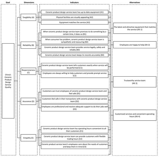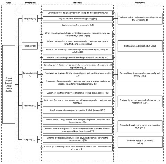 Despite this, there is still a lack of related research using the SERVQUAL scale to measure service quality in China’s ceramic product design industry. Therefore, we first attempted to establish a service quality evaluation framework based on the SERVQUAL scale, specifically tailored to China’s ceramic product design industry. Subsequently, the weights of service quality aspects and indicators relevant to this industry were analysed and calculated. Subsequently, service quality solutions were evaluated and ranked with the aim of providing relevant decision-making suggestions to promote the provision of exemplary service quality in China’s ceramic product design industry. In view of this, we established a framework grounded in the SERVQUAL scale to measure service quality within China’s ceramic product design industry. This was achieved through questionnaires distributed amongst experts in the field. Subsequently, the fuzzy analytic hierarchy process (FAHP) was employed to calculate the weights of dimensions and indicators. Finally, we utilised the measurement of alternatives and ranking according to the compromise solution (MARCOS) to rank all alternatives, thereby addressing the following research objectives: