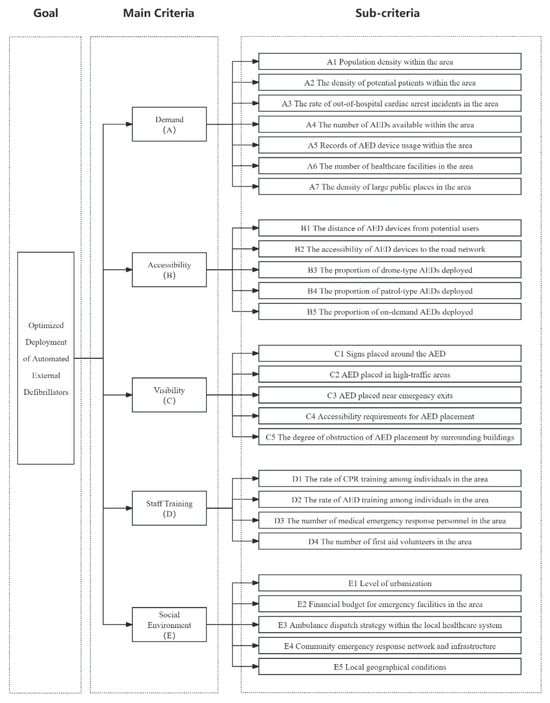 In this study, the development of guidelines is the foundation. Only by having effective guidelines can experts make better judgments and choices, thus making the importance ranking of AED deployment guidelines obtained through data more reliable. After literature research, we finalized 5 primary guidelines and 26 minor guidelines. The evaluation process is divided into two levels: the first level consists of 5 main criteria and the second level consists of 26 secondary criteria. The details of the evaluation criteria are shown in Figure 2.
