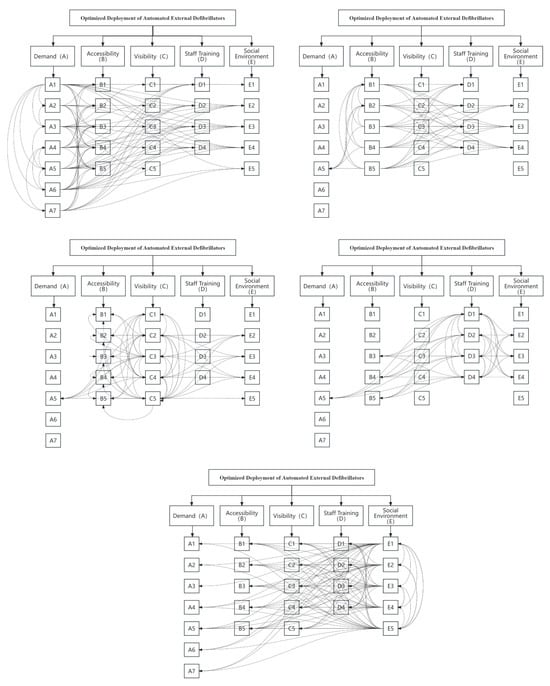 Furthermore, based on the suggestions of 15 experts, this study obtained the interdependence relationships between the main criteria and sub-criteria, thereby establishing the hierarchical structure and network structure of the criteria influencing the optimization deployment of AED, as shown in Figure 3.
