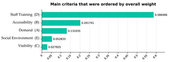 The fifth major criterion is the social environment. Based on the study by Chen et al. [], we added this primary criterion and set five relevant secondary criteria: the level of urbanization, the fiscal budget of the region’s emergency facilities, the ambulance dispatch strategy of the region’s healthcare system, the community’s emergency response network and infrastructure, and the region’s geography.