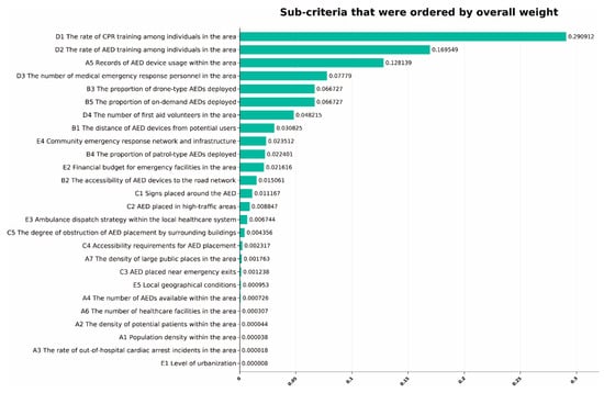 The fourth to eighth important sub-criteria are as follows: the number of medical emergency response personnel in the area, the proportion of drone-type AEDs deployed, the proportion of on-demand AEDs deployed, the number of first aid volunteers in the area, and the distance of AED devices from potential users. Considering the considerations, it is evident that the deployment of AEDs necessitates a focus on a number of key points. Firstly, equip AED devices based on the number of medical personnel and first aid volunteers in the area. Secondly, increase the proportion of drone-type AEDs and on-demand AEDs appropriately. Moreover, the distance between devices and potential users should be considered, which aligns with the grid-based strategy commonly used in deploying AED devices in most current research.