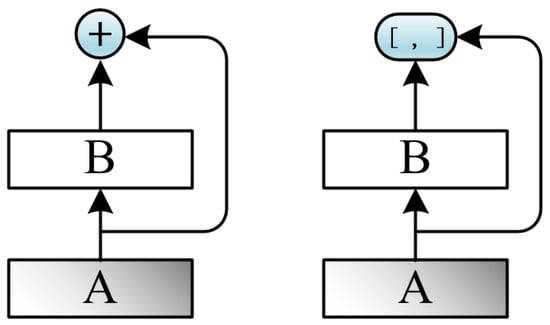 Its basic idea is consistent with ResNet, but it establishes a dense connection between all previous layers and the subsequent layer, from which it derives its name. Equation (1) shows the connection method for ResNet (on the left of Figure 1), and Equation (2) shows the connection method for DenseNet (on the right of Figure 1). Another main feature of DenseNet is the reuse of features through the connection of features across channels, which directly connects all layers while ensuring maximum information transmission between layers in the network. DenseNet employs a strong implicit monitoring mode, where each layer establishes a connection with the previous layers. Error signals can easily propagate to earlier layers, allowing them to receive direct feedback from the final classification layer. DenseNet has the following advantages:
