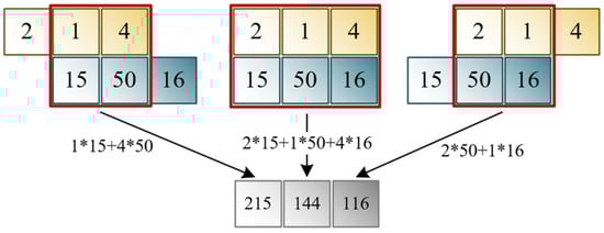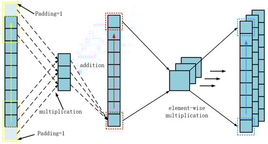 Suppose there are currently data with a length of 3, its padding being 1, stride 1, and a convolutional kernel size 1 × 3. Then, The working diagram of the convolutional kernel is shown in Figure 4: