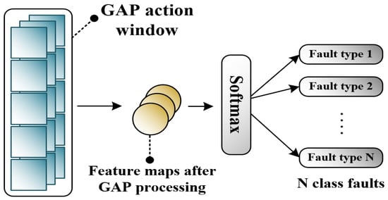 Traditional DenseNet uses two linear layers for classification, which consumes a large amount of computing resources, increases model complexity, and is prone to overfitting []. In this study, we employed one-dimensional global average pooling (1D-GAP) before Softmax for classification. The 1D-GAP layer is a specially designed pooling architecture with dimension adaptation, aimed at reducing the number of model parameters and improving the operational speed of the algorithm. It also adaptively matches the dimension transformation between the last DenseBlock layer and the Softmax layer. In this study, we designed a 1D-GAP layer to replace the two fully connected (FC) layers in the traditional model, as shown in Figure 8.