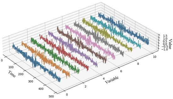 A total of 1223 sensors were used for data collection, including measurements of parameters such as rotational speed, gas flow, vacuum degree, liquid level, pressure, and temperature, as well as correlation data between various mechanical components, pipelines, compressors, and other equipment. Clearly, the data from the experiment exhibit high dimensionality and strong coupling characteristics. Given that the data collected under actual operating conditions include complex environmental noise and anomalies recorded during manual machine operation, the noisy compressor unit data shown in Figure 18 is also suitable for evaluating the model’s noise resistance.