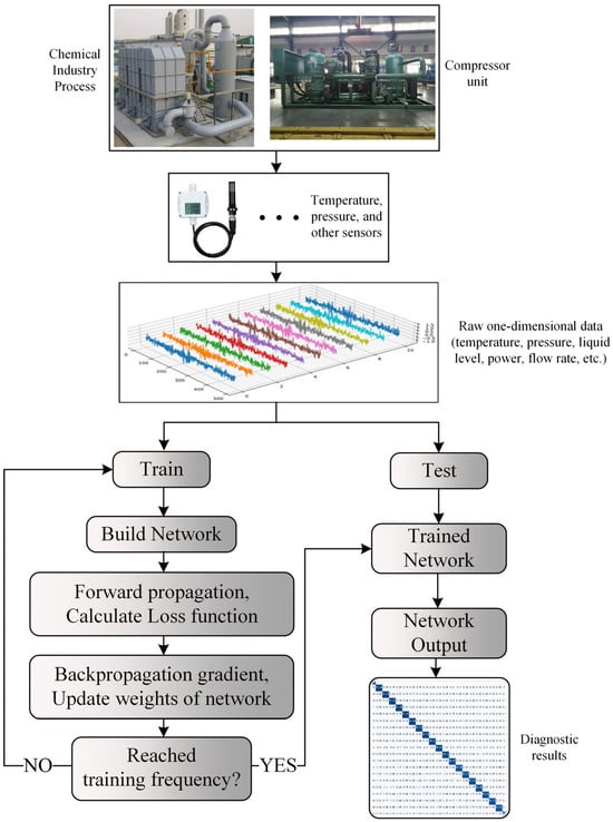 In the field of fault diagnosis research, the methods can be broadly categorized into analytical-model-based methods, expert-knowledge-based methods, and data-driven methods []. Analytical-model-based methods become challenging to compute when dealing with high-dimensional complex data due to the increased complexity of modern process industry systems. Expert-knowledge-based methods include approaches such as artificial neural networks, expert systems, and fault trees []. These methods rely on experienced operators or experts as the core, establishing corresponding fault relationships based on the representation of fault states. However, these methods are relatively difficult to implement and thus have not been widely adopted. Data-driven methods can be divided into three categories: statistical-analysis-based methods, signal-processing-based methods, and artificial intelligence-based methods. Statistical-analysis-based methods characterize and utilize correlations between variables and are suitable for fault detection in high-dimensional systems. Common methods include Principal Component Analysis (PCA), Independent Component Analysis (ICA), and Partial Least Squares (PLS) [,,,,,]. Signal-processing-based methods are traditional approaches for condition monitoring and fault diagnosis, using techniques like correlation functions, time-frequency spectra, and autoregressive moving averages to obtain and analyze signal features such as mean, kurtosis, amplitude, and phase to determine system status and fault modes. Common methods include Fast Fourier Transform (FFT), Wavelet Transform (WT), Hilbert–Huang Transform (HHT), and Spectral Analysis (SA) [,,,,]. Artificial intelligence-based methods directly utilize process data to establish monitoring models, extracting data features from historical and real-time data for fault monitoring. The main methods include Bayesian Networks (BNs), Support Vector Machine (SVM), and neural networks [,,]. Although there have been significant advancements in these fault diagnosis methods, for complex process industry systems, the extraction of fault features still requires domain-specific knowledge, and the recognition accuracy of these methods needs further improvement.