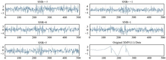 Since the TEP dataset consists of simulated data, it is idealized and does not replicate the complex environmental noise present in actual industrial processes. To address the issue mentioned in the introduction, Gaussian noise with different signal-to-noise ratios (SNR) is added to the TEP dataset to simulate various industrial environments. Gaussian noise with SNRs of −5, −1, 0, 1, and 5 is used to simulate different operating conditions. The network parameters are set as described in Section 3.1.4, and ten parallel experiments are conducted to obtain the average results. Figure 14 shows the results for the XMV(11) variable in Fault 18 after being contaminated with Gaussian noise at different SNR levels. As the SNR decreases, the original data are increasingly polluted.