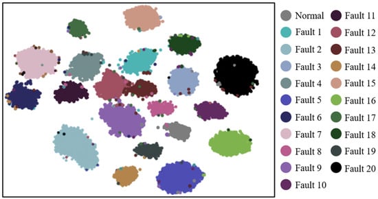 With the reduction in SNR, the oscillation amplitude of the original data increased, and the original features were increasingly obscured by noise. The results, shown in the following table from multiple variable operating condition experiments, demonstrate that the proposed method model has a strong ability to extract abstract features. Even in extreme cases with an SNR of 1, the accuracy still reached 87.41%, representing only a 6.21% decrease in performance compared to the ideal state, as shown in Table 7. Therefore, the proposed method has good noise immunity. To visualize the effect of fault classification on the test set, t-distributed stochastic neighbor embedding (t-SNE) was used to map the features of the network output layer to a two-dimensional plane, with the results shown in Figure 15. Since the classification accuracy is only 87.41%, some point distributions are not concentrated enough. Figure 16 shows the classification confusion matrix of the DSCBAM-DenseNet model for TE data at an SNR of -5, and Table 8 presents the three evaluation metrics for the DSCBAM-DenseNet model: accuracy, recall, and F1 score.