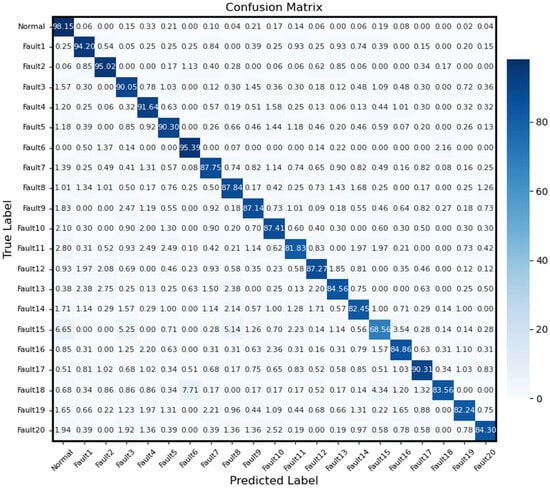 Table 5 records the identification accuracy and standard deviation for the 21 types of faults across the 10 parallel experiments. It is evident from the table that this method performed well on the public dataset. Thanks to the DSC characteristics, which fully integrate the time series correlation of each sensor and the cross-channel correlation of different sensors, the fault monitoring model exhibited enhanced classification performance. The average accuracy for the 21 classifications reached 93.65%, with an average standard deviation of only 0.48%, indicating that the method proposed in this study is both accurate and stable.