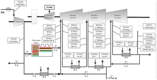 To further validate the effectiveness of the algorithm proposed in this study, experimental data from a compressor unit in a chemical process was collected for further research. The schematic diagram of the compressor unit is shown in Figure 17. This CO2 compressor pressurizes the carbon dioxide gas from the decarbonization unit in the ammonia synthesis workshop to 7.108 MPa and sends it to the stripping tower. Due to long-term full-load operation, scaling in the circulation section increases the pressure difference, leading to severe load fluctuations and sudden steam temperature rise, which in turn causes faults.