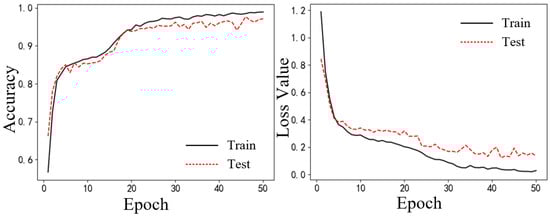 Historical data were used to train the network. The training process of DSCBAM-DenseNet is shown in Figure 19. The performance of the trained model on the test set is presented in Table 9. According to the experimental results, the average accuracy of ten parallel experiments reached 99.81%, with a standard deviation (SD) of 0.32%. Despite the high dimensionality and multiple types of input data, as well as severe environmental noise, this model still exhibited excellent performance.