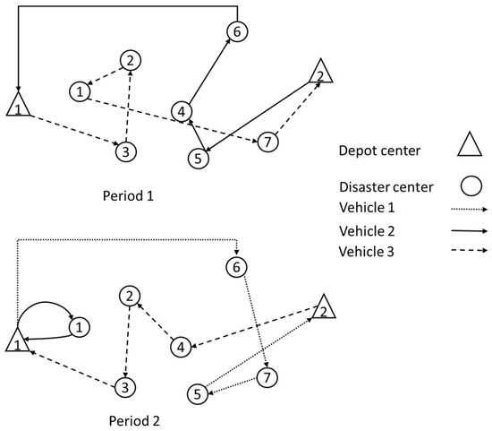 The second experiment presents a small example demonstrating the key concepts and results of the proposed model and solution approach. It involves a two-objective, two-period fuzzy vehicle routing and scheduling problem with seven disaster centers and two distribution centers. The problem’s parameters are detailed in