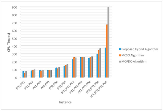 Figure 2 compares the execution times of the three algorithms. The results show that the proposed algorithm consistently outperforms the MCSO algorithm in execution time. Furthermore, the MOFDO algorithm has consumed longer execution times in all cases. In general, the proposed hybrid algorithm typically produces results that are better or at least comparable to those of the MCSO and MOFDO algorithms, according to the findings reported.