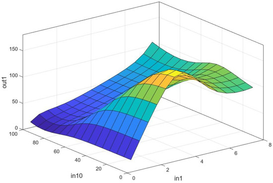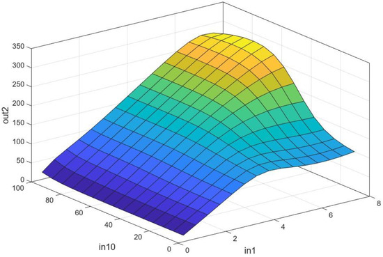 In this case as well, nonlinearity can be observed, with maximum output values occurring when both inputs are at higher levels. The surface has relatively smooth transitions between different values, indicating a relatively stable system that does not show abrupt jumps in output values. Such stability is desirable as it ensures the appropriate consistency of the system in response to changes in inputs.