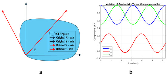 Modeling fiber orientation and its effects is vital for designing CFRP components, optimizing performance for safety and efficiency. Therefore, let us consider two Cartesian axis systems, one original and one rotated, representing the fiber orientation in CFRP (Figure 1a). Indicating by the domain of the CFRP (conductor), , in CFRP the base fiber orientation defines the conductivity tensor in the original configuration as (in order not to burden the notation, the functional dependence on is implied) [9,34,35,36]