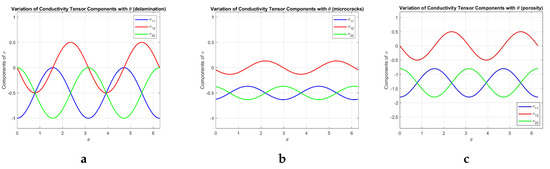 As above, Figure 2c depicts the variation of the components of as a function of in the presence of porosity. Furthermore, in this case, while still maintaining the wave phenomenon (but with reduced amplitude compared to previous cases), a reduction in conductivity is observed due to the presence of voids in the material.