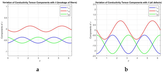 Figure 3a shows how the breakage of fibers affects the components of . Particularly, it is clear that, unlike other defects, the influence that the breakage of the fibers manifests in terms of conductivity is considerably reduced. It follows that, on a hypothetical scale of risk of defects, the breakage of the fibers does not raise particular concerns.