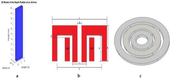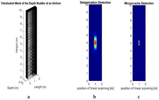 (a) Three-dimensional visualization of a depth rudder mesh model, featuring an irregular tetrahedral mesh with enhanced densification. This finely tuned mesh is critical for accurately capturing the smallest variations in conductivity due to the near-absence of delamination effects. (b) Numerical simulation with sub-surface delamination (); (c) with sub-surface microcracks ().